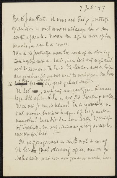 This is a letter written by Antoon Derkinderen to Jan Veth in August of 1895. Though seemingly a simple personal correspondence, the act of writing itself carries a profound symbolic weight, echoing classical traditions where letters were vital for conveying thoughts and maintaining connections across distances. The handwritten script, flowing and intimate, recalls the ancient practice of calligraphy, transforming mere words into artful expressions of the soul. This act of communication, though personal, transcends its immediate context. Think of the letters of Cicero, or even the carefully inscribed tablets of ancient Sumer; each medium carrying messages across millennia. The very essence of writing is an attempt to capture and preserve thought, a bulwark against the erosive forces of time. The letter becomes a relic, a testament to the enduring human need to connect, to share, and to leave a trace of one's existence.