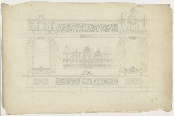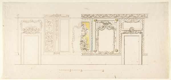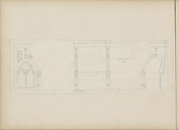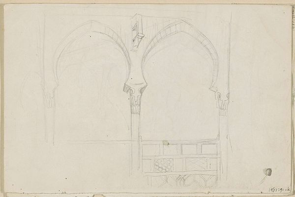 Editor: This drawing, "Verzierung einer rundbogigen Türöffnung sowie ein Biforium" by Friedrich Maximilian Hessemer, made with pencil and ink in 1829, showcases meticulous geometric patterns. The precision in line work is remarkable. What do you make of the composition here? Curator: The drawing exhibits a fascinating exploration of form through line. Consider the interplay between the rounded arch and the rigid geometric infill. Hessemer emphasizes the inherent tension between organic and inorganic shapes. Editor: I see the tension, especially in how the curves of the arch are echoed, but also broken, by the straight lines within. It's a really interesting juxtaposition. Curator: Precisely. And note how the artist has used line weight and density to suggest depth and shadow, manipulating our perception of form. Observe also the relation between the decorative framing in the drawing's upper-left and the biforium displayed on the right. How are they similar? How do they differ? Editor: I think the symmetry and repetition are definitely connecting elements, but one is so much more ornate than the other. It feels like he's comparing two different levels of detail. Curator: Yes, indeed. Hessemer invites us to analyze how simple geometric forms combine to create more complex and evocative structures. His choices elevate simple lines into powerful communicators. Editor: I’ve never thought about architecture quite this way, deconstructing it to its basic visual components. Curator: By focusing on these intrinsic qualities, Hessemer encourages us to see architecture as more than mere shelter, and instead recognize the power of geometric vocabulary to define space.
