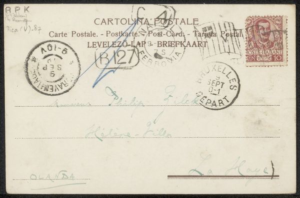 Editor: We’re looking at a postcard, "Briefkaart aan Philip Zilcken," possibly from 1905. It's ink and pen on paper, with some added stamps and postal marks. The handwriting and different scripts give it a layered feel. What strikes me is how ephemeral and fragile the piece seems, and I’m wondering how you interpret its visual aspects? Curator: The power here lies in its layered presentation. Consider the interplay between the planned printed words – the standardized postal greetings in multiple languages, forming an organized block – against the personal script of the message itself. Observe the rhythm established by the handwriting, its variable pressure creating a dance of line and form. Even the obliteration by postal stamps contributes to the piece's aesthetic texture. Editor: So, it's less about what the message *says* and more about *how* it's visually communicated? Curator: Precisely. The superimposition of text and stamps alters the legibility, moving us from practical communication to visual contemplation. The medium of ink lends a certain finality, yet the postcard remains a fleeting, transient object, passed through many hands. Are you struck by the stamp itself and the message next to it? Editor: Now that you point it out, the density of that area definitely stands out with the faded portrait on the stamp. It really accentuates that particular space. Curator: Yes, and consider that a stamp’s design elements – portrait, typography, denomination – contribute another layer of intended meaning and graphic quality, existing alongside and competing with the spontaneous markings of the sender. What's also unique here are the colors. Do the faint greenish pencil lines add a certain element to the composition in your eye? Editor: Yes, absolutely, the different ink densities create movement on the paper and emphasizes certain phrases. I suppose I hadn't considered how much information is actually embedded in the ink and placement alone. Curator: And that visual richness far transcends the basic function of the postcard, highlighting the art in everyday communication. It showcases how the deliberate choice of layout can change one's viewing of the postcard.