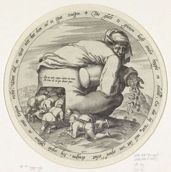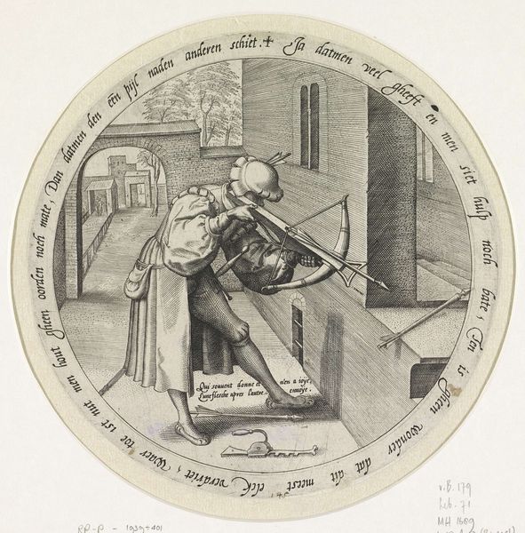 Curator: Let’s take a look at an engraving dating from 1566 to 1570 titled, "De rijke man speelt viool op een kaakbeen" now at the Rijksmuseum. It's attributed to Wierix. What's your immediate reaction? Editor: Stark and unsettling. The composition, trapped in this circular frame, feels incredibly tight. There’s this grim quality to the whole thing, even with the rather foppish figure at the center. Curator: Absolutely. He sits astride a massive jawbone, looking rather self-satisfied as he plays his instrument. That jawbone… it’s such a powerful symbol of mortality. Even his finery doesn't seem to diminish its weight. I can't help thinking that it functions as an allegorical image of mortality, pleasure, and transience. Editor: Right. It draws the eye immediately, doesn’t it? That the artist chose this—likely copperplate—to etch and then print many times… well, there’s a real physical commitment to circulating this message. There is clear attention paid to material detail: the man's plush garments and the detailed towers in the background. These require a specific sort of making that is reliant on the access to certain materials and also specific type of patronage to justify that. Curator: It underscores a keen interest in contrasting fleeting earthly pleasures with inevitable decay. The man is richly dressed, with musical accomplishment, seated jauntily; his posture mocks what we understand from that imposing jawbone beneath. Editor: Agreed. And thinking about it as a print—an easily reproduced and widely distributed image—emphasizes how Wierix critiques class disparity, I believe. To show wealth balanced upon bones really highlights the precarity of class differences. Curator: Consider also that small figure perched atop a tower on the right. I feel as if he suggests something about the fragility of earthly power – all observed and surveilled, as temporal and contingent as that jawbone might suggest. Editor: So much here hints at moralizing impulses mediated through detailed and exquisite craftsmanship. That Wierix uses the form of printmaking only enhances the potency of his message across place and time. It is, to be fair, a fascinating use of the form. Curator: I agree wholeheartedly. There's a layered, lingering presence to the artwork. Editor: Indeed. Thanks for shedding more light on the symbolism.