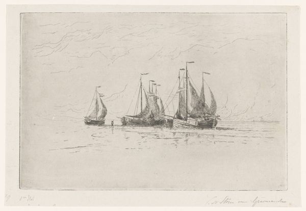 Editor: This etching, "Zeilschip Walvisch uit Oostende op onrustige zee" created by Egidius Linnig in 1842, captures quite a dramatic scene. The rough sea is really the focus for me. How might this work speak to its viewers during that particular time? Curator: That's a great observation. Given the rising tides of nationalism in 19th-century Europe, seascapes were more than just pretty pictures; they could become potent symbols of a nation's power and reach. Look at the *Walvisch*, it isn’t idealized, it is dealing with rough waters, quite close to a capsized ship, if I am seeing correctly. It shows daily life and how vulnerable society was, and invites viewers to really empathize. How might the commercial maritime history impact such art? Editor: That makes perfect sense. The scene, almost looks chaotic. Was there something specific about that reality Linnig was trying to capture, aside from glorifying Belgium's might? Curator: Potentially. Romanticism really held sway, then and Linnig shows us raw emotion in the face of the immensity of nature. Maybe he sought to capture the inherent risks of seafaring, its social impact. It challenges viewers to see both the grandeur and the peril. The maritime activities formed a critical backdrop of daily existence in that era. Consider also where this etching would be displayed – in homes, print shops? Its audience impacts our understanding. How did the rise of print culture help shape views of naval prowess? Editor: That is an angle I hadn't considered. So this isn’t just about what Linnig wanted to say, but about how it engaged within broader conversations? Thank you! Curator: Exactly. It's about art functioning within a historical tapestry. Always look to the conversations surrounding the piece as much as to the piece itself!