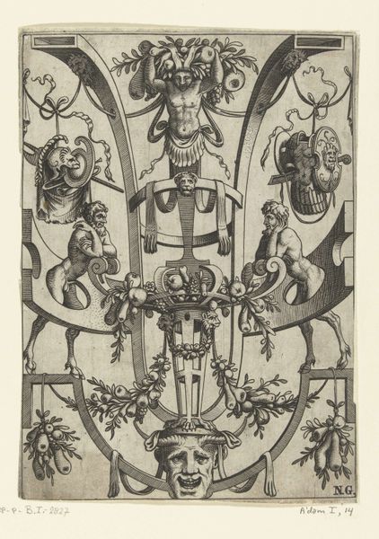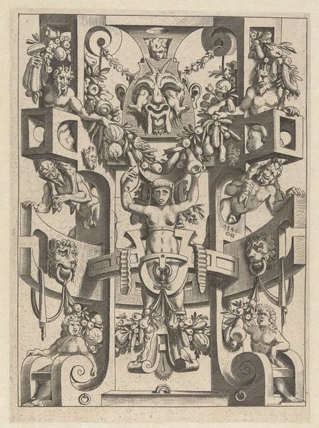 This print, "Niche in the Form of a Cartouche," was created by Johannes van Doetecum I in the 16th century using etching. The composition is an intricate assembly of architectural and figural elements, primarily in monochrome. The cartouche form is densely populated with classical motifs, creating a visual experience that is both ornamental and slightly overwhelming. The figures, ranging from human to grotesque, are arranged symmetrically around the central niche, contributing to a balanced yet complex structure. This elaborate design reflects the Mannerist style, which favored complexity, exaggeration, and a departure from the harmonious ideals of the High Renaissance. The artist uses these classical forms to destabilize established meanings. The symmetry offers a sense of order, but the grotesque figures and dense ornamentation challenge any fixed interpretation, engaging with new ways of thinking about representation.