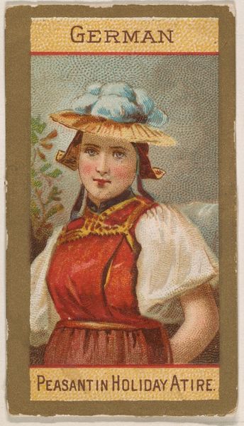 Curator: Ah, the *Blennies* card from the series *Fishers and Fish*, created around 1888 by Knapp & Company. Part of a larger set commissioned for Duke brand cigarettes. What’s your take on it? Editor: Well, my immediate thought is about the depiction of femininity here. It's a curious, slightly unsettling image, with the oversized head on that very dainty, hyper-feminized body. The flower-laden hat, the little pink dress—it’s almost cartoonish. Curator: It's Japonisme in full swing. Consider how ukiyo-e prints influenced Western artists' approach to flattening perspective and decorative patterning. It reflects the Victorian era's fascination with exoticism and incorporating global aesthetics into commercial imagery. Editor: Yes, but the caricature almost borders on satire, doesn't it? I find myself wondering about the social context. Is it meant to be a celebratory portrait of idealized womanhood, or is there a subtle critique of Victorian gender roles at play? And the direct connection to tobacco consumption, it's worth examining this construction of femininity in relation to consumer culture. Curator: And those "masculine" domains of fishing are increasingly entered by women. The commercial image operates precisely within those evolving parameters of what is thinkable. The fishing rod seems to me not merely incidental, but is actually positioned to cross with that pink and flowered feminity. Editor: Indeed. The presence of that, rather pitiful, blenny caught on her fishing line provides a stark counterpoint. Does this depiction symbolize female empowerment, albeit filtered through the male gaze? Or does it reinforce existing societal hierarchies? Curator: The card itself served a purpose, it promoted cigarettes within an emergent culture of advertising. Looking closely, the watercolor lithograph gives us some insight into that historical shift into modern economies. Editor: So, beneath the surface of this seemingly simple promotional card lies a whole complex web of social, cultural, and gendered meanings. A fascinating glimpse into a very specific moment in history. Curator: Exactly, looking at the imagery used to encourage and enable various historical consumptions of tobacco and other habits also offers many other insights when looking at marketing today.