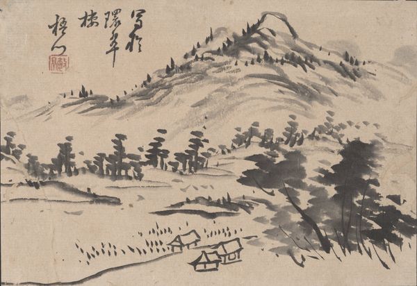 Editor: Here we have "Landschap," a watercolor and drawing on paper created sometime between 1850 and 1900 by Cheng Men. The subdued palette creates a peaceful mood, almost like looking at a memory. The composition feels very deliberate. What do you see in this piece? Curator: The composition is indeed masterful, achieved through calculated deployment of line and the delicate layering of washes. Note how the artist uses line not only to delineate form, but also to suggest texture, especially in the depiction of the rocks and foliage. This emphasis on formal elements directs our reading. Do you perceive how line and colour interact in relationship? Editor: Yes, the colour palette is restrained. The grey tones and minimal blues enhance the intricate linework; together, they create form, but they feel very dreamlike. Is there significance in its seeming incompleteness? Curator: "Incompleteness" is a western concept; let's say instead, a controlled articulation of implied form and line. The work eschews complete representationalism to foreground visual construction. Ask yourself, how does this choice affect our perception of 'landscape' as a subject? How do you understand its construction of 'depth'? Editor: It is true, focusing on composition pulls you away from reading it purely as landscape, as you're immediately considering surface treatment and line variation. Thank you; I see it much more clearly now as a formal exercise and how those formal decisions are doing a lot of work here. Curator: Exactly. It is precisely within those deliberate formal articulations that the art's significance resides. Considering formal arrangements before contextual interpretation is essential.