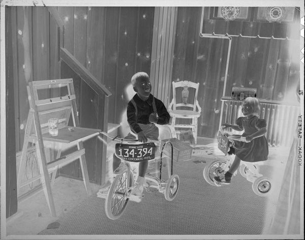 Editor: This is "Untitled (girl on floor by Christmas tree)" by Lucian and Mary Brown. I see an inverted photographic print of a young girl with her gifts and a Christmas tree. What strikes me is the composition; the distribution of light and dark shapes seems carefully planned. What do you see in this piece? Curator: Indeed. Note how the inverted tones emphasize the geometric forms. The contrast between the girl's dress and the dark background creates a striking silhouette. The tree, a cascade of light, provides a visual counterpoint. Editor: So, you are drawn to the formal elements first? Curator: Precisely. The interplay of positive and negative space is paramount. The surface texture of the print itself is equally important, contributing to the overall aesthetic experience. Have you considered the implications of the negative image? Editor: I had not, but I will now. Thank you for pointing out the importance of the visual elements in the picture.