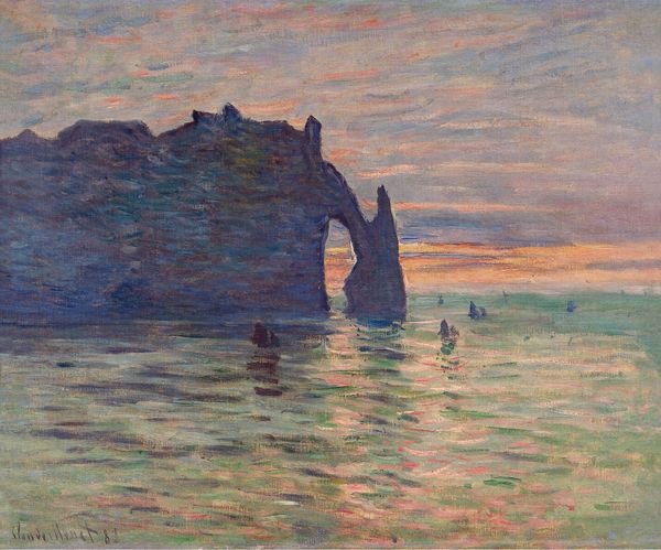 Curator: Before us is Claude Monet's "Etretat, Cliff of d'Aval, Sunset," painted in 1885. The canvas captures a striking coastal scene in France, rendered in oil with that distinct Impressionist style. Editor: The colours! It’s all blazing warmth – those yellows, oranges, and touches of fiery red in the sky reflected in the sea. The cliff looms on the left, a stark silhouette against the setting sun, though it seems to be softening along with everything else. It really envelops you in the heat of the moment. Curator: Absolutely. Monet's work here showcases the principles of plein-air painting, moving outdoors to capture fleeting moments of natural light and atmosphere, emphasizing subjectivity. It’s the essence of Impressionism— the experience is valued above accuracy of depiction. Editor: It is interesting how Monet returned to the same locations repeatedly, portraying this same arch at different times of day. Looking at how Monet focuses on the changing qualities of light in "Etretat, Cliff of d'Aval, Sunset" through that feminist lens – it reminds me that, historically, artistic movements often sidelined female artists who engaged with similar innovative techniques, like Berthe Morisot, to depict fleeting impressions of domestic life. Curator: That is true. Though this was a very popular and well-established site of recreation in the nineteenth century. So even though these paintings focused on natural themes, in this period of expansion of leisure, the city becomes another landscape for modernity. Editor: It's such a seemingly tranquil scene, yet thinking of those tensions simmering beneath the surface gives me a different perspective on the constant push and pull in Monet's work between stability and transience, solid forms, and fleeting impressions. It is like we're seeing beauty coexisting with disruption. Curator: Indeed. "Etretat, Cliff of d'Aval, Sunset" offers a moment of pause, inviting viewers to contemplate both the inherent beauty of nature and the intricate relationships that constitute it. Editor: Yes, seeing the interplay between technique, context and cultural implications reveals how landscape painting reflects complex social concerns while encouraging critical thought.