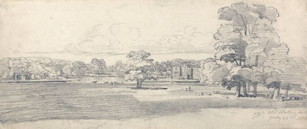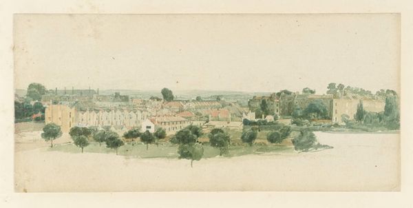 Curator: Right now, we're looking at "View of University Park looking towards New College, Oxford," a watercolor on paper, likely done en plein air between 1825 and 1840 by William Turner of Oxford. Editor: It's awfully… placid, isn’t it? That huge expanse of field, the muted sky… almost feels like a sigh. Like a watercolour daydream from a bygone era. Curator: Daydream is spot on! The Romantic movement loved finding grandeur and emotional resonance in landscapes, and this perfectly embodies that. Note how he's used watercolor to capture the hazy atmosphere, imbuing this rather ordinary park with this subtle ethereal quality. Editor: The park becomes an empty vessel, no? University Park – which sounds important! – appears as barely a presence against this yawning meadow and limitless sky. It brings to mind those "Campus" images, pastoral lands viewed from great cathedrals or chapels, promising the attainment of enlightenment beyond... Curator: The buildings act like jewels on the horizon, don't they? Think of Oxford as a place steeped in history and learning. By depicting the park in such a soft, tranquil light, Turner elevates it into something idyllic, perhaps representative of idealized youth and aspiration. The very essence of the Romantic movement can be visualized. Editor: But also a symbol of temporal limitations, with light ever threatening to obliterate all signs of distinction or even identity, fading, blurred as a dream... or a lost opportunity, you know? Why are we constantly drawn to imagery representing idealized landscapes like this... ? Is it some collective yearning to go back in time, beyond concrete definitions or rigid boundaries? Curator: It might be less about looking back, but using these landscapes as an introspective journey to understand better the "now." By seeing potential for reflection and emotional projection, that yearning can begin. I appreciate that Turner can evoke those kinds of introspections. Editor: Fair enough. It's nice that this park, a piece of lived history, can trigger so much discussion still! Curator: Absolutely. These paintings offer glimpses of cultural and architectural touchstones to our experiences and understandings, both back then and in our own world.