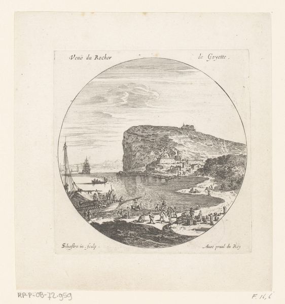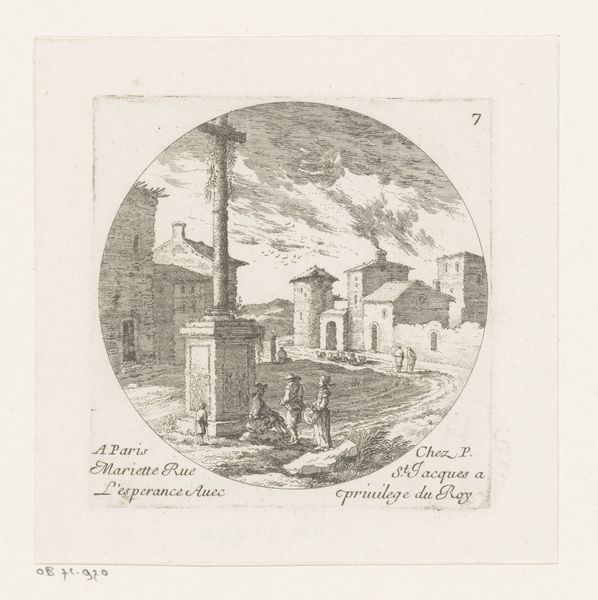 Editor: This is "Figuren bij ruïne van een poort," or Figures by a Ruined Gate, an engraving by Nicolas Perelle, created sometime between 1613 and 1695. It’s at the Rijksmuseum. The composition is very striking with its circular border and contrasts between the crumbling structures and the figures. How do you interpret this work? Curator: The most compelling aspect lies in the meticulous rendering of textures and forms. Notice the variation in line weight used to depict the crumbling stone, evoking a sense of decay and the passage of time. Consider also the spatial organization: the artist employs a sophisticated understanding of perspective, guiding the eye through the depicted cityscape. How does this perspectival structure impact your interpretation of the print? Editor: I see what you mean. The lines draw you in. But I initially saw just a crumbling city, not decay exactly. Curator: Precisely! And how does the limited tonal range influence your perception of depth and volume within the composition? Observe how the areas of denser hatching create a sense of shadow, effectively modeling the architectural forms. Editor: The light and shadow give depth to it and help give it shape. And I hadn't noticed before that it leads the eye back towards the spire. Curator: Indeed. It's a remarkable study in the power of line and composition. The artist created form and depth without color. I appreciate the artist's strategic and methodical approach to the spatial composition within the pictorial space. Editor: Thanks. Looking at it from your perspective, it does seem like the power of the engraving really shines through in its details. Curator: Exactly. Close visual analysis illuminates an artwork's internal structure and overall meaning, apart from what we know about its historical context.
