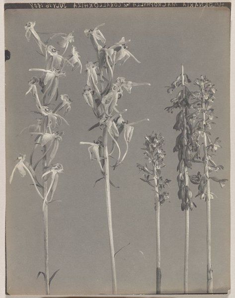 Curator: Isn’t that evocative? I find myself strangely moved by Edwin Hale Lincoln’s 1931 photograph, "Habenaria psycodes- Small Purple Fringed Orchid". The black and white tones lend it a ghostly quality, don't you think? Editor: Indeed. There's something starkly elegant about its composition. I am interested in how the materials serve the overall image, this kind of photograph is so concerned with labor, darkroom practice, and all. Curator: Absolutely. It’s as though he’s distilled the very essence of these delicate orchids—they almost feel like memories fading into the background. Editor: Speaking of essence, what fascinates me are the choices that determine what details were captured, and how. It isn't just seeing a flower, it's understanding that silver particles on paper are meticulously arranged, almost building the flower layer by layer. What do you think that kind of production and framing achieves? Curator: A sense of permanence, perhaps? A defiance against the fleeting beauty of nature. The rigid process, oddly enough, brings a soft grace in contrast. Also, I am aware that this is more than mere botanical documentation; the artistry breathes a melancholic spirit. Editor: True, especially considering photography’s growing role within advertising and commercial industries. Choosing an orchid transforms something often thought of for consumption into an enduring record. Curator: Yes, these types of commercial undertones and constraints are actually very evident, the whole genre is caught within the balance of its beauty and commodity. To see it simply as the artistic expression misses something important about why we encounter still lifes in our cultural life. Editor: Indeed. Thinking about consumption, one has to ask how we 'consume' these images, particularly considering the legacy of the orchid's social life through upper-class fashion and collection, that too affects my perception. Curator: That’s quite a provocative point—it makes you reconsider its seemingly serene quality! In all, seeing these orchids reminds me of an enduring emblem of subtle, ethereal strength and quiet beauty. Editor: Agreed. Edwin Hale Lincoln shows us that beauty, like labor, exists in multiple layers. A haunting image in both creation and result.