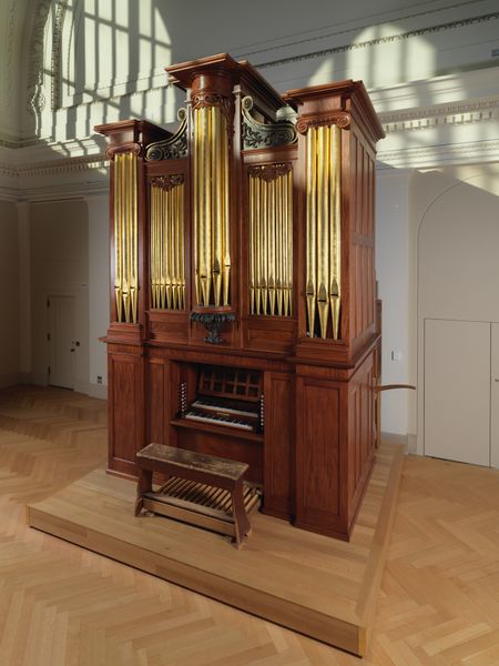 This pipe organ was crafted by Richard M. Ferris in the mid-19th century, primarily from wood, with accents in metal and fabric. The choice of rosewood for the case speaks to the elaborate tastes of the time, its dense grain requiring careful labor to work and polish. Notice how the wood has been crafted, with carved details showing hand-tooling. The organ's design blends the robust aesthetic with the finesse of skilled joinery. The metal pipes, carefully tuned, represent another layer of skilled work. The fabric behind them adds a softening effect, contrasting with the solid wood. The organ has a keyboard and foot pedals, creating a complex interaction between performer and instrument. All of these features demonstrate that the making of this object would have involved intense labor and craftsmanship, tying it to the social context of its time.