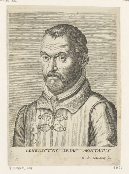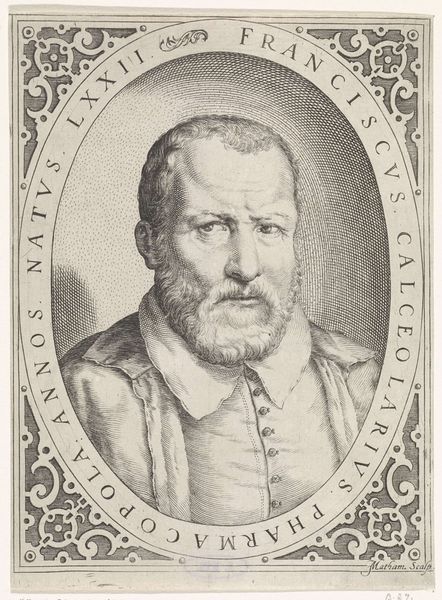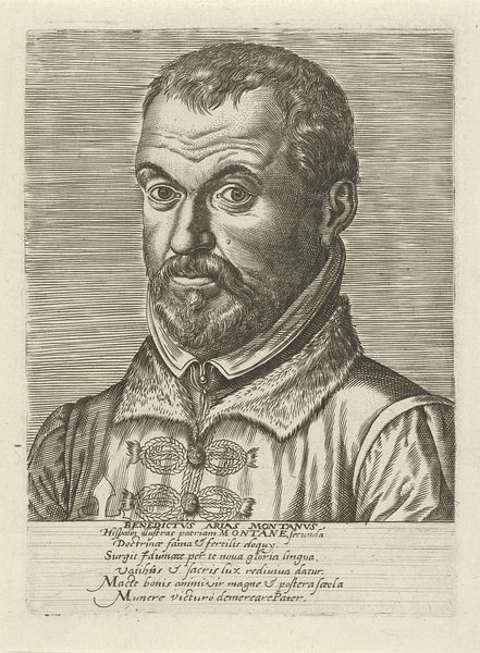 Curator: Look at this finely detailed engraving, "Portret van Cornelis Cort," crafted in 1598 by Hendrick Hondius I. It's currently housed in the Rijksmuseum. Editor: Immediately, I'm struck by the intense gaze. It's quite direct, almost confrontational, which is interesting given the medium and the period. The tight curls of his hair, that intricate ruff—it's all so meticulously rendered. Curator: Indeed. Cort was a renowned engraver himself, and Hondius clearly emphasizes his profession through the precise linework. Consider how the background alternates between cross-hatching and parallel lines. Hondius uses line to render light, form, and even mood. Editor: And those details surrounding his identity below the portrait are fascinating too. I noticed the inscription below his image indicates he was 42 years old when he passed, so that makes him quite young when viewing it through the lens of our current understanding of life expectancy and challenges traditional ideals about portraits. I am curious how his life, profession, and art shaped society at this moment. Curator: That's astute. Contextualizing Cornelis Cort's place in the art world helps us understand the socio-political influences on him as a working engraver, especially because the engraving's proliferation aided the spread of visual ideas. Printmakers during this era often facilitated an interconnected artistic community and allowed artists to disseminate visual language to broader society through the circulation of images. The medium and methods reflect a deep awareness of artistic lineage and community in terms of what and how art could mean during this time. Editor: The dialogue between tradition and progress resonates deeply, I think. In essence, the work serves as an opportunity for us to confront preconceived notions about art, artists, and historical paradigms. The very act of creating, in my view, represents resistance against imposed structures and societal norms that sought to marginalize or silence certain voices, so that fact adds more emotion when understanding a life dedicated to this. Curator: Your perspective really underlines the complexity inherent in seemingly simple portraits. It definitely brings another dimension to appreciating not just the artistry, but also the cultural environment. Editor: Yes, and reflecting on all of this makes me appreciate it anew!