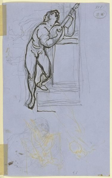 Curator: Victor Müller's pencil drawing captures a scene titled "Francesca and Paolo, together floating in the second circle of Hell, below right, the lamenting Dante, comforted by Virgil." It’s housed here at the Städel Museum. Editor: What strikes me immediately is the raw emotionality, even in a preliminary sketch. The barely-there lines convey such anguish and swirling torment. Curator: Absolutely. Romanticism reveled in the depiction of intense emotion, often drawn from literary sources, as is the case here, representing an episode from Dante’s Inferno. Notice how Müller uses swirling lines to evoke a sense of relentless, unending movement. That represents the eternal storm that imprisons these lovers in Hell. Editor: I find it compelling how the bodies of Francesca and Paolo seem intertwined yet separate, suggesting their bond and eternal punishment. Their love becomes the source of their torment, eternally blown around. I wonder how Victorian audiences would have responded to this treatment of female desire and its consequences? It reflects the tight constraints around female sexuality in the 19th century, perhaps? Curator: Undeniably. These figures—Francesca in particular—became iconic during this period. In mythology and literature, a forbidden kiss often signals an inevitable descent—moral, spiritual, and, as shown here, even physical, a sort of symbol set. Editor: That speaks to the artwork's broader implications too, touching on issues of morality, societal expectations, and the complex ways love can be both liberating and destructive, depending on your gender, status, race, time period… Curator: Very well. Beyond the tragic romance and moral judgement, though, it is interesting to me how the depiction follows existing archetypes, creating images that reflect deeper anxieties about transgression. Editor: It feels timeless in its rawness and universal condemnation, unfortunately. A stark depiction of how patriarchal structures punish female desire and freedom, unfortunately echoing realities still faced today. Curator: Perhaps. A reminder that art can both reflect and question, mirroring our history. Editor: Precisely, forcing us to consider what has changed, what hasn’t, and where we need to go from here.