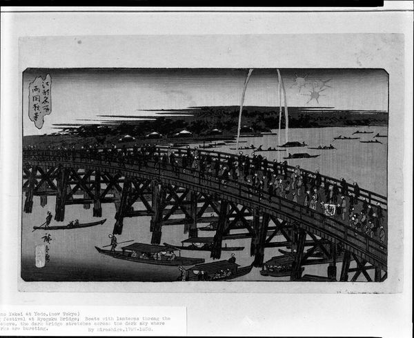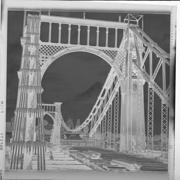 Editor: Here we have Jack Gould's "Untitled (bridge construction)," a silver gelatin print measuring about 4 by 5 inches. The high contrast creates a striking geometric composition. What do you see in this piece? Curator: The stark contrast certainly emphasizes the structural elements. The bridge’s architecture, a network of triangles and verticals, dominates the frame. Consider how the inverted tonality affects your perception of depth and form. Editor: It almost flattens the image, making the bridge seem more like a drawing than a photograph. Curator: Precisely. The medium and its manipulation become the message. The subject is secondary to the interplay of light, shadow, and line. Editor: I hadn't considered how much the inversion impacted the composition itself. Thanks! Curator: Indeed, a deeper appreciation arises from analyzing the formal aspects of this photographic print.
