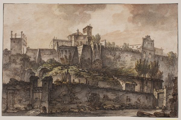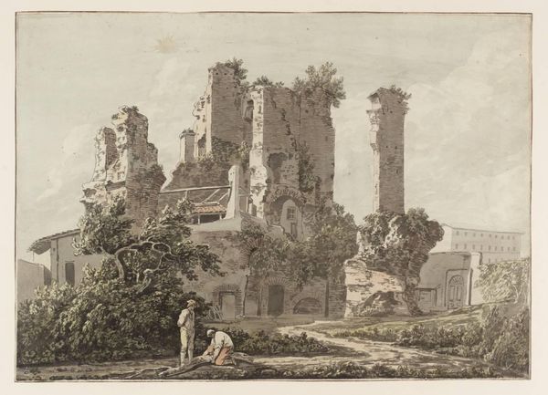 Editor: This watercolor by Jan Philip Reuthel Jr., titled "Ruïne van het Huis ter Haar bij Maarssen" from 1797, is really striking. It's a melancholic image of a ruined castle. What significance do you see in these ruins? Curator: The ruin itself speaks volumes. It is, after all, more than just broken brick; it embodies cultural memory and the passage of time. Note how Romanticism favored such imagery, a reflection on the ephemerality of human creation. Does the ruined castle remind you of anything in particular? Editor: Hmm, maybe a feeling of loss, but also of nature reclaiming what was once built. Curator: Precisely. Notice the artist included figures: one sketching the ruin, others fishing nearby. Consider what the artist is implying with this inclusion. The artist-figure implies preservation; that they’re literally attempting to retain and preserve the memory of this structure. And that memory may speak to power lost, history forgotten. Editor: That's interesting, how one element might speak to cultural memories. And those other figures don't seem affected at all by the ruins... just another day. Curator: An important contrast! What is powerful in a ruin? Is it in the emotional associations? Editor: Now I understand the power of its symbolism. The painting acts as both a memorial and a meditation on life's continuities. Curator: Exactly. And by showing it to us today, this landscape continues that life. Thank you for this enlightening exchange!