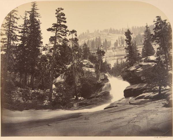 Editor: This is “40 Fotos, page 14,” a 1946 gelatin-silver print by Robert Frank. It feels very classical, like a Romantic landscape painting almost, with its rushing water and dramatic cliffs, but there's also this raw, almost documentarian quality because it's a photograph. How do you interpret this work through a historical lens? Curator: Considering its date, 1946, we’re just emerging from World War II. Landscape photography at this time takes on a new significance. How does Frank’s choice to depict a powerful, natural scene – the antithesis of urban landscapes devastated by war - inform your reading? Editor: Well, it feels like a kind of rebuilding, a return to something primal and strong. Almost like an act of defiance against destruction? Curator: Precisely. Photography moved into fine art galleries and museums. Its reception depended upon the kind of art spaces that legitimized them and gave them political voice. Frank highlights something enduring, almost untouched by the war's impact, although its distribution relied entirely on the cultural institutions that made it legible. Consider how that tension impacts your understanding of its message? Editor: That makes me see how it's also participating in this post-war construction of "Switzerland" and Swiss identity, relying on nature and purity at this moment. Curator: Exactly! How do these factors shape your overall perception? Editor: I see that its beauty can be deceptive. The image embodies historical forces and participates in shaping a specific cultural narrative within this time, and now. Thanks for highlighting all this! Curator: Indeed! Considering how context reshapes our interpretation is invaluable.