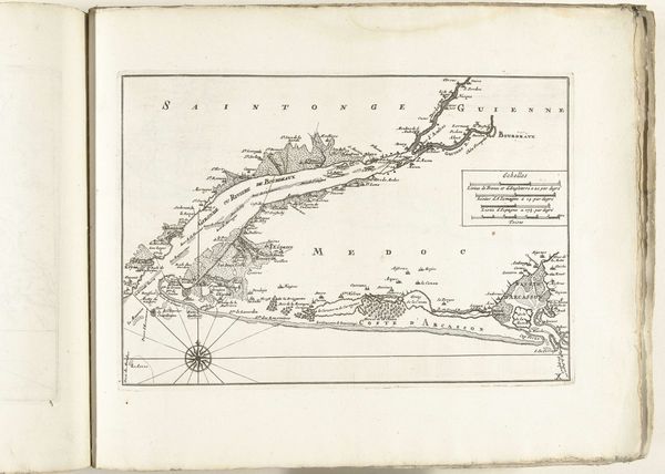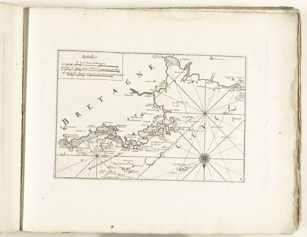 Editor: This is a map titled "Kaart van de zuidkust van Bretagne bij Nantes," created around 1702. It’s an anonymous piece from the Rijksmuseum, done in ink and engraving on paper. The intricacy of the line work is what first struck me; what do you see in the structure of this map that might be particularly meaningful? Curator: I note immediately the emphasis on delineation. Consider how the cartographer has meticulously transcribed coastline, using precise hatching to define landmass versus water. It isn't just about geographical accuracy. The formal relationships between these areas invite an analysis of power dynamics through spatial control. The neat inscription further highlights an intention for order and understanding in a chaotic world. Editor: So, the stark contrast is intentional to establish order and convey control. How does the materiality, the ink on paper, influence this interpretation? Curator: Indeed. The starkness, the indelible nature of ink, suggests permanence, authority. Engraving, in its reproductive capacity, disseminates that authority, effectively distributing a certain viewpoint across a wider audience. What message might be gleaned from its relatively small size and placement within the larger book? Editor: I see... its placement allows for a more intimate engagement. The formal qualities are indeed interconnected, the meticulous details emphasizing the power embedded in the structure. Curator: Precisely. The objective record becomes subjective statement. And a detailed semiotic examination allows us to appreciate how cartography is inherently an artistic act, regardless of perceived objectivity. Editor: Thank you. I definitely look at maps differently now, appreciating their inherent artistic statement rather than simple documents of a location.