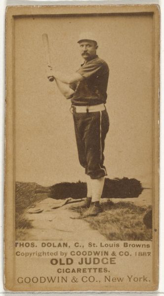 Curator: Let’s discuss this intriguing piece from 1888. This is a photographic print entitled "Purcell, 1st Base, Philadelphia Athletics" made by Goodwin & Company as part of the Old Judge Cigarettes series. Editor: Immediately, the sepia tones give it such a strong sense of nostalgia. It really anchors the work in its specific time. You can almost smell the tobacco, can't you? And, look, it’s worn, handled, a thing made for exchange. Curator: Exactly! And that commercial context is crucial. It depicts an athlete, placing him within a burgeoning culture of celebrity and commodity. What does the mass production of such an image signify regarding early sports culture? Editor: I’m also struck by the photographic process itself, the albumen print, likely from a glass negative. It gives the image a subtle texture and tonal range that evokes more detail. Think about the labor involved in setting up the shot, processing the image, printing and distributing these cards with packs of cigarettes. Curator: Precisely! It highlights a shift in societal values as baseball gains popularity, reflecting America's changing cultural landscape as leisure became commodified alongside race and class divides. The idealized male form celebrated while marginalized voices remain unheard and unseen. Editor: Absolutely. The pose itself is interesting. Not mid-action, but seemingly caught in a reflective moment. It humanizes Purcell beyond simply being an athlete. There's a story implied in the materials, distribution, and representation that shows a network of makers and distributors. Curator: What implications might the subject of athleticism, specifically baseball, have for the cultural construction of masculinity during that time? How are notions of the body, race, and American identity interwoven into this representation of sports culture? Editor: For me, it opens a dialogue about the changing relationship between labor and leisure and between photographic portraiture and popular culture. These cards really changed the meaning of celebrity itself. I hadn't considered that sports culture was intertwined in advertising and commodification at its beginnings, though. Curator: Yes! And understanding these contexts challenges us to look at not only this one particular photograph, but its dissemination. Thinking about how such imagery contributes to constructing ideas about identity, race, gender and sports—it asks us to reassess whose stories get told and preserved in history.