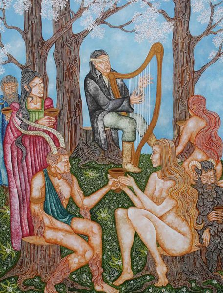 Editor: Here we have Tadeusz Makowski's "Bucolic" from 1920, done with oil paint. The figures and vibrant colors give the painting such a whimsical, dreamlike quality. What strikes you when you look at this piece? Curator: The artist’s method of applying paint in short strokes catches my attention. Notice how this technique yields not merely figures, but figures defined by the very texture and dynamism of the medium itself. Consider the relationship between the color palettes used for each child; does this deliberate distinction influence how we perceive them as individual figures within the unified composition? Editor: That’s interesting; I was too busy looking at the light to think of individual elements like that. They feel almost like two halves of a whole, now that you mention it, joined by the composition. Are those asymmetries in the faces intentional? Curator: Quite possibly. Focus on the painting’s engagement with perspective; specifically, the way that traditional rules are undermined, flattened perhaps, to bring our attention to the formal qualities of the painting rather than verisimilitude. How does the deliberate choice to move away from realism inform your viewing experience? Editor: I guess it's a reminder that I'm looking at a painting, at artifice. I see the surface differently now. Thanks. Curator: Indeed. We begin to unravel the intention through meticulous assessment of its elements and its visual language. Editor: Exactly. It also makes me consider how different art movements influence each other, playing on contrasts. It opens the door to deeper investigation, I agree.