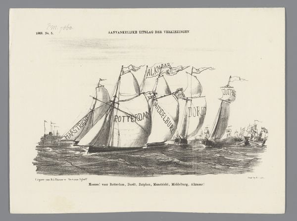 Johan Michaël Schmidt Crans created this political cartoon about The Hague's municipal government in 1882. Immediately, we see the stark contrast between the detailed rendering of the grounded boat and the more sketch-like figures attempting to move it. This stylistic choice emphasizes the immobility of the vessel, a visual metaphor for governmental stagnation. The monochrome palette reinforces the cartoon's critical tone, reducing the scene to its essential forms and message. The artist employs line work to define the textures of the sand and the rough surfaces of the boat, drawing attention to the futility of the figures' efforts. The composition directs our gaze to the banner reading "Bathhouse Question," suggesting that this specific issue has become an immovable object, much like the boat itself. The title of the cartoon "A boat that cannot be gotten to sea" confirms this interpretation, presenting a commentary on political obstacles. The entire scene functions as a semiotic system, where each element—the boat, the figures, the banner—acts as a signifier within a broader critique of governance.