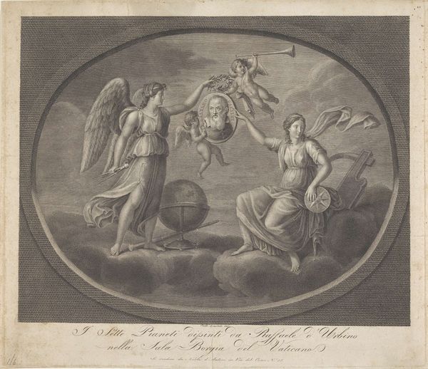 Curator: Here we have Conte Carlo Lasinio’s “Frontispiece: I Sette Pianeti” rendered in sanguine. What strikes you first about its presentation? Editor: I'm drawn to the color; it feels like looking at a memory, something seen through rose-tinted glasses. How was this print created, and how does that inform its meaning? Curator: Lasinio was likely interested in reproducing Raphael’s frescos, democratizing access through printmaking. The earthbound instruments juxtapose the floating figures, a tension between earthly knowledge and divine inspiration. Editor: Exactly! I wonder about the socio-political context of replicating Raphael’s work. Who was this for? Was it meant to elevate or democratize art for specific social classes? Curator: The piece invites us to consider the relationship between art, power, and accessibility, asking who gets to define and control the artistic narrative. Editor: It is powerful to see how this piece allows us to consider these complex themes. Curator: Absolutely. This print, in its very making, engages with enduring questions about art’s role in culture and society.