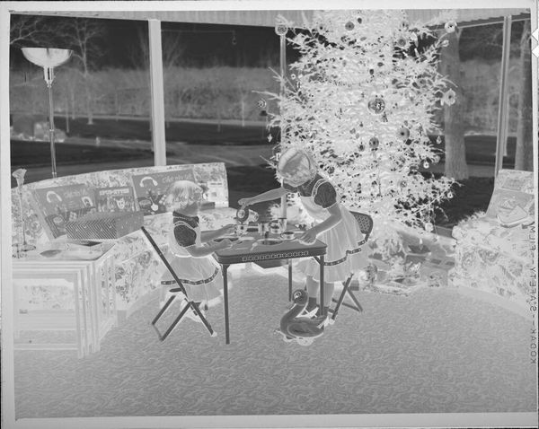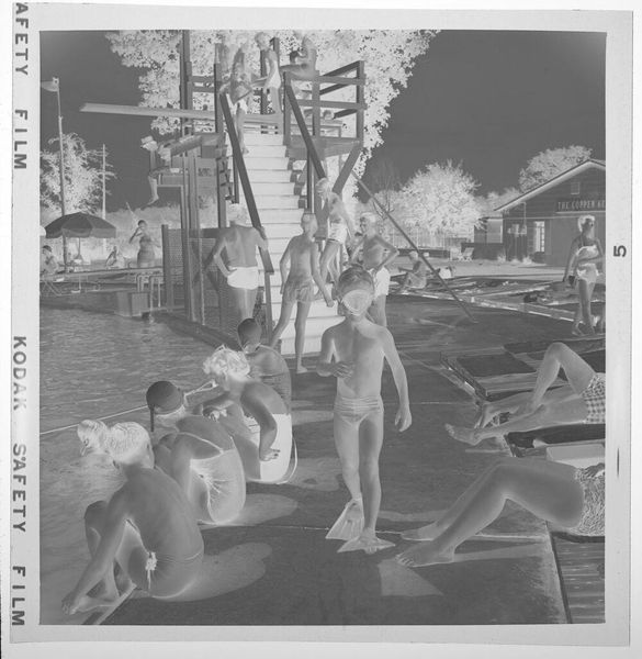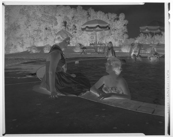 Curator: Martin Schweig's photo, aptly titled "Untitled (two women posing at edge of pool during party)," presents us with an intriguing snapshot of leisure. Editor: It’s got this dreamlike quality, doesn't it? Like a half-remembered summer afternoon, all filtered light and quiet anticipation. Curator: The image size is roughly 4x5 inches. This smaller format adds an intimacy, as if it’s a candid moment shared among friends. Editor: Almost secretive, yeah. Makes you wonder about their stories, the unspoken words hanging in the air around that pool. Curator: Absolutely. It's fascinating how a seemingly simple image can evoke so much speculation about social interactions and the culture surrounding such gatherings. Editor: Makes me want to dive right into the mystery.