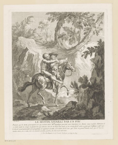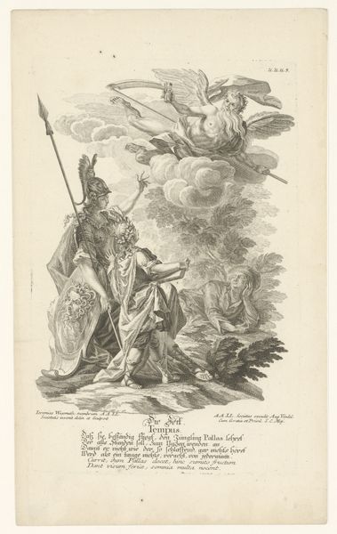 Curator: Well, look at this biting satire. There's an angel seemingly blessing this very cynical tableau. Editor: Cynical is right! It’s visually dense, like a recipe with too many ingredients. Very busy; I see some figures bent over what looks like a map. Curator: Precisely. What you're seeing is an engraving by Noël Le Mire, titled 'Satirical Representation with Catherine II of Russia, Stanislas II, Emperor Joseph II, and Emperor Frederick II with a Map of Poland', dating back to the 1770s. Editor: The cake… That's Poland, right? Being sliced and diced? What a visual metaphor! Curator: Indeed. The composition is structured with meticulous attention to detail; each character is rendered with distinct attributes. Catherine, Joseph, and Frederick literally carve up Poland, embodying their imperial ambitions. The seraph above with a trumpet... is she mocking or legitimizing their actions, I wonder? It all seems a bit Rococo, playful, even. Editor: But under that playful surface is a pretty harsh political critique. It's not just the act of dividing Poland that is disturbing, but the almost casual, ceremonial manner it's depicted. Rococo gone rogue. It's pretty dark under all that frothy detail. It feels like the artist is inviting us to recognize the deceptive beauty that cloaks brutal political realities. Curator: It feels as if the artist knew well that these powerful rulers may feel absolutely no moral unease over it, or be wholly aware of the wider reaching implications for that matter. Even if there may be awareness, there appears to be, at least according to this representation of them, a detachedness, and what can feel to me as somewhat akin to sheer, gluttonous greediness. Editor: Looking at the line work itself – the way Le Mire uses varied etching techniques, dense in areas, airy in others – it’s as though he's visually enacting this political drama. The delicate details against the weighty subject matter create a tension. I do have to admit this piece feels particularly… salient today. Curator: Indeed. What at first might feel whimsical becomes a disturbing mirror. Editor: So next time someone tells me "Let them eat cake," I’ll be seeing this! Curator: Absolutely. It gives pause for thought on what such ‘cake’ means, or symbolizes at various junctures of human history.
