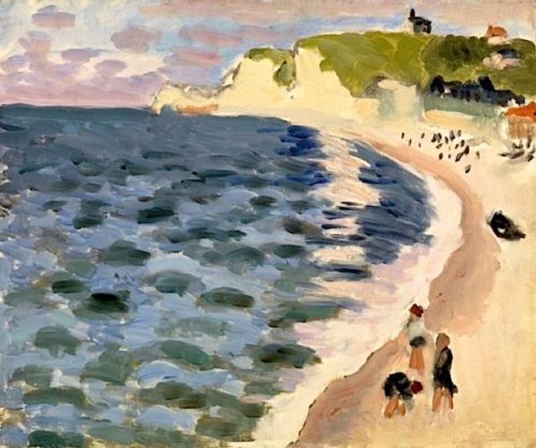 Curator: Before us, we have Maximilien Luce's "La Plage De Mers-Les-Bains," an oil painting dating to 1934. It certainly captures a moment of leisure. Editor: There's a muted, almost dreamlike quality to the colors. It's summery but without the harshness you might expect. What strikes me is the light. How would you describe the composition? Curator: Formally, Luce's application of Impressionist techniques—short brushstrokes, the broken color—defines the beach scene. Note the composition. Luce uses a high horizon line, common among his landscapes that divides land and the distant background. It makes use of those flattened perspective characteristic of much post-impressionist painting. What strikes me more, however, is how Luce often painted workers and laborers; here he shows their leisure, suggesting evolving societal conditions and increased access to time-off and the sea. Editor: Yes, the light! It unifies the whole scene. The softness you pointed out is likely down to those colors and those shorter strokes he employed. The darker blue costumes create a subtle tension with the surrounding pastel shades. This palette choice creates a tranquil, nostalgic mood. It brings out a striking effect on the representation of sunlight and shadow. Curator: Absolutely, and you cannot dismiss that shift from a more laborious subject. Here Luce captures a social scene in leisure. It highlights access and changing dynamics. We also have to acknowledge the shift in production as a function of this new access to leisure – with companies providing seaside goods and entertainment that capitalize on that market. Editor: Perhaps the charm comes from this balanced color contrast? The artist's technical understanding comes together. We're left with a quiet, peaceful impression. I almost feel a salty breeze looking at it! Curator: For me, it’s the suggestion of access – what used to be inaccessible to all now enjoyed as a common moment, though with hints of labor present through the equipment they use for playing on the sand. That is quite a compelling concept. Editor: And for me, it's a masterclass in capturing a mood. It goes to show you how crucial formal techniques can influence art viewing.