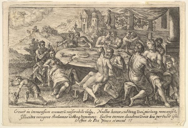 Curator: Pieter van der Borcht the Elder created this engraving, titled "The World Upside Down," sometime between 1576 and 1608. It resides now in the Rijksmuseum. My immediate response is one of confusion. The image seems crowded with strange allegorical figures and chaotic activity in the background. Editor: Yes, chaotic is a great descriptor. The detail is extraordinary; my eye is immediately drawn to the bizarre juxtaposition of images. The angel, with the open book showing the words “recht” and “leert,” is particularly striking next to that scene of destruction in the background. The central female figure is, in some way, in juxtaposition with both of them. Curator: The engraving style lends itself to such density, and it allows the artist to express societal anxieties about the perceived disruption of the natural and moral order. There's so much political turmoil across the continent. Editor: The reversed or inverted world motif appears across different cultures throughout history and, most profoundly, during periods of upheaval. It uses striking symbolic reversals – like virtue asleep while chaos reigns. This piece truly captures that symbolic tension, doesn’t it? The inclusion of specific symbolic elements adds layers, too – for example, is that Father Time resting on what looks to be the Gates of Hell? Curator: Indeed, and this inverted world became a powerful vehicle for social critique. If you look at it from the perspective of the time, societal elites and the political status quo saw this engraving as reflecting concerns that the world was spinning out of control. Notice also how Van der Borcht used a globe as the locus from which this entire disruption radiates, reminding us that all this turmoil occurs on earth itself. Editor: Absolutely, it brings to mind ideas of shifting power dynamics. These aren't just aesthetic choices. They are carefully chosen symbols reflecting deep-seated cultural fears and philosophical inquiries into morality. The central maternal figure also suggests a world struggling with perverted and corrupted values, perhaps suggesting a new path is needed to address what is occurring on that very plane of existence. Curator: Exactly! So the print acts as a historical marker, a document reflecting the political and cultural struggles of the late 16th century, providing us with an insight into anxieties over religious wars, economic uncertainty, and societal change. Editor: Reflecting upon this image, it serves as a powerful memento mori for collective values as opposed to a solely individual reflection on death. We ought to consider which threads of meaning and fears resonate with us today, centuries later.