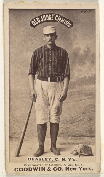 This is Fred "Sure Shot" Dunlap, Captain of Pittsburgh, a photographic print made in the United States as part of the Old Judge series for Old Judge Cigarettes in 1888. The image offers a glimpse into the intertwined histories of commercial culture and the burgeoning sport of baseball in late 19th century America. Printed on trading cards, images like these were distributed with consumer products like tobacco to promote brand recognition and customer loyalty. The picture creates meaning through visual codes and cultural references: Dunlap’s pose, holding his bat, constructs him as a heroic figure. The image reflects a moment when baseball was becoming professionalized and commercialized. Such images of players helped to build their celebrity, turning working-class athletes into household names. In turn, this popularity was used to promote consumer goods. To understand this image better, we might research the history of baseball, advertising, and the popular press. These resources would shed light on how sporting heroes were manufactured and consumed in this period.