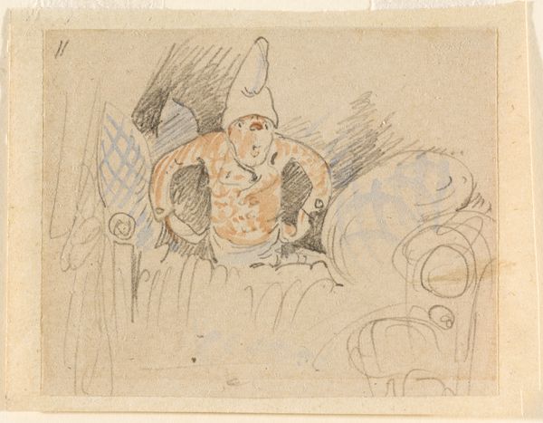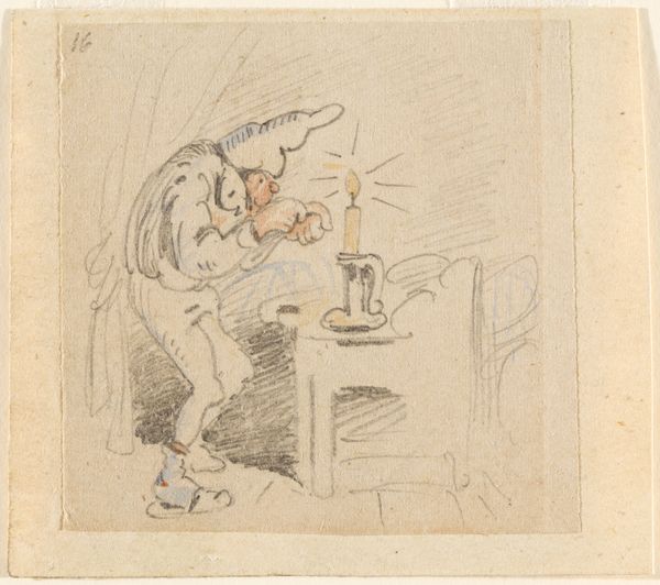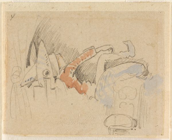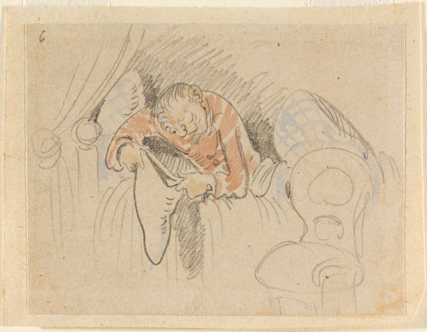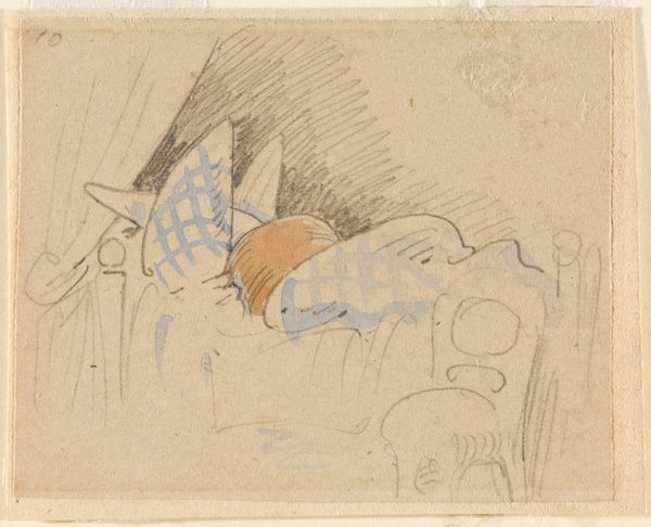 Curator: Here we have a piece by Wilhelm Busch, from 1862. The title, translated, is "The disturbed, but happily regained night's rest (The Flea)." It’s rendered in pencil and charcoal, currently residing at the Städel Museum. Editor: Immediately I notice the economy of line; it feels quite immediate, almost like a quickly jotted down note. You can see the artist’s hand so clearly in the visible pencil strokes that it feels intimate. And I find the composition oddly off-kilter. Curator: Indeed. Busch was, of course, a master of visual storytelling, especially through caricature. Consider the central figure, viewed from behind, caught mid-scratch – a universal pose born from shared, if unwanted, experience. It embodies that fleeting irritation disrupting our peaceful slumber. Editor: Yes, but even the materials used point to something deeper about artmaking in this period. Charcoal and pencil are easily accessible; perfect for quickly capturing an idea but also mass production and illustration. They speak of the expanding visual culture of 19th century Germany. Curator: Absolutely. The work points toward universal anxieties made visible. The very idea of a ‘fleeting’ and 'unwanted experience', gives rise to associations from simple everyday anxieties about comfort and luxury to grand existentialist themes such as chaos or disease that permeates the supposed serenity of life. The decorative elements almost mocking in juxtaposition to the figures distress. Editor: And how might his work challenge notions about 'high' art? This seems so intentionally raw in execution that I’d call it deliberately unpolished. Curator: Precisely. He wasn't necessarily aiming for pristine refinement but rather direct emotional engagement, making something universally resonant accessible with what was readily at hand. A great commentary. Editor: In Busch's hand, the base materials transcend mere function and become a conscious choice; highlighting art's potential for humor, social commentary, and reflection upon life’s unavoidable moments of discomfort and momentary anxiety. Curator: Well put. It certainly reveals the emotional continuity that can arise between the personal anxieties and collective consciousness. Editor: And reminds us that art doesn't always have to be grandiose to be insightful. It can spring from simple means and tackle universal frustrations.