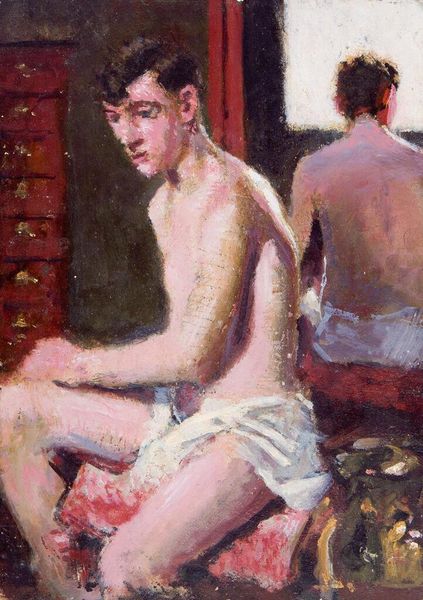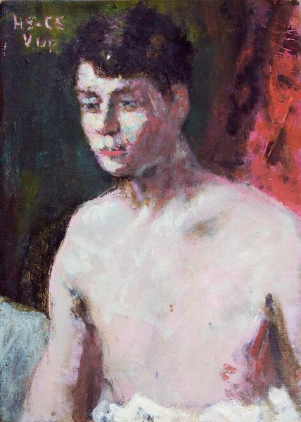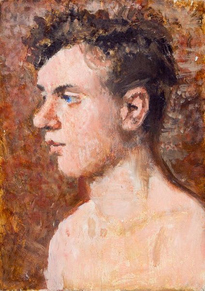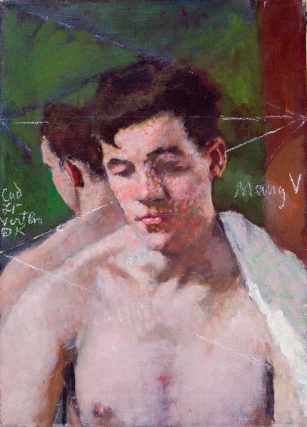 Editor: This is "Walter Nelson" by Denman Waldo Ross, an oil painting at the Harvard Art Museums. I'm immediately struck by the fragmented symbols in the background. What do you make of those markings? Curator: The background’s geometry and textual fragments operate as a kind of personal iconography. Consider how the numbers and partial words might allude to specific memories or associations only the artist and sitter understood. What effect does this have? Editor: It feels like a private language, almost dreamlike in its obscurity, adding layers to a simple portrait. I hadn't thought of it as a personal symbolic code before. Curator: Indeed. And that intimate language embedded in the image invites us to ponder the boundaries between public representation and private meaning. Editor: I see that now. The painting becomes more than just a likeness; it's a repository of shared experiences and secrets. Thanks!