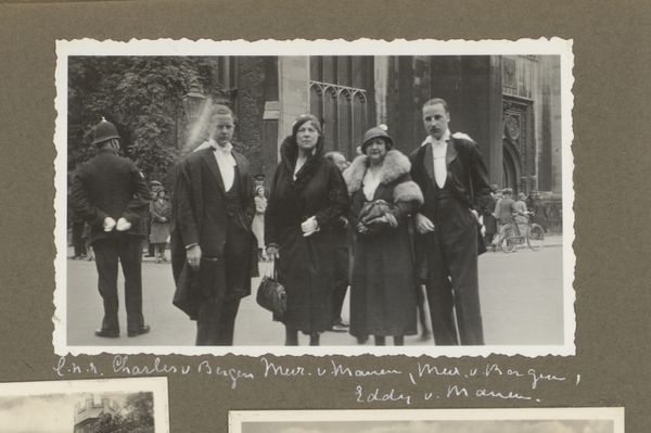 Curator: Looking at this photograph, I immediately notice the light. It’s soft, diffused, making everything appear somewhat ethereal. Editor: And indeed, this is an intriguing gelatin silver print titled “Groepsportret van een gezelschap, lopend in Scheveningen,” or “Group portrait of a company, walking in Scheveningen.” It’s estimated to have been created between 1932 and 1937 by an anonymous photographer. What's striking is how it captures an ordinary scene. Curator: "Ordinary," perhaps, but elevated by the detail. The clothes they're wearing, those stripes, the cloth of that baby stroller: a strong index of middle-class identity on holiday. Consider also the labor of producing these garments. Editor: That's a valuable point. The choice of Scheveningen as the backdrop speaks volumes about leisure, access, and social mobility in that period. We are looking at a constructed image of modernity and perhaps even upward mobility for this specific social group. Curator: There’s something almost performative about it. Are they consciously posing or is this just a snapshot capturing their lifestyle? The clothing worn by members in the photograph signifies social codes. The casual jackets, light summer dresses... materials meant to look elegant yet practical, probably sourced through burgeoning department stores in urban centers. Editor: Yes, I agree! The very act of commissioning such a photo—presumably by the subjects themselves, considering the nature of group portraits—suggests a self-awareness, a deliberate act of documenting their presence in this space, affirming their participation in contemporary culture. It would be easy to say “just a family”, but so much more than just that is present in the historical context, which we should reflect on. Curator: Well said, because examining the materiality allows us a better lens for the nuances involved in creating an image of leisure, and for seeing the craftsmanship in the cloth and the development of the photograph itself as commodities. It asks viewers now to recognize what went into their depiction, what labor was obscured in making the scene. Editor: Looking at this photo, then, encourages one to ask who is included and, more importantly, who isn’t. Where is everyone else, and why did this group decide to leave a portrait behind like this, for people such as us to view? It’s this tension between individual lives and social frameworks that really holds my interest. Curator: Ultimately, analyzing process and material transforms how we interact with such snapshots, inviting viewers to look past mere imagery and to analyze an age's industrial and production efforts. Editor: Precisely! A photograph captures a single moment but its relevance stretches across years if viewed critically.