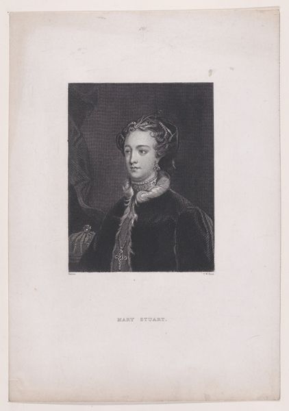 Editor: So, here we have "Mary, Queen of Scots" from "The Pictorial History of Scotland," volume 1, created in 1871 by Thomas William Hunt. It's a black and white print, an engraving to be precise. I find her expression quite enigmatic. What are your thoughts? How do you interpret this work? Curator: Immediately, the symbols around her whisper stories of power and tragedy. The elaborate ruff, for instance – a symbol of high status, but also perhaps, a confining barrier. What feelings does that evoke for you? Editor: It definitely suggests confinement. And the cross pendant seems significant too. Curator: Absolutely. Consider how religious symbols were often deployed to bolster a ruler's legitimacy, but for Mary, religion became a point of conflict and ultimately contributed to her downfall. Notice, too, the detail in the drapery behind her. What might that backdrop represent? Editor: Possibly her royal chambers or hinting at the weight of the crown? It adds to the formality, almost a stage-like presence. Curator: Precisely. Hunt’s careful depiction places Mary within the long line of Scottish monarchs, a cultural memory etched in visual form, ripe with emotional power. She is presented both as an individual and as a symbol of a nation, carrying all its hopes and anxieties. The echoes of her reign are still present today in Scotland's culture. Editor: That's a powerful point. It’s like the image carries not just her story but the story of a whole country. I'll definitely think about that "confining barrier" and "religious conflict" framing her entire legacy. Curator: Indeed. Art like this is less about replicating her physical likeness and more about what she represents, continuing to shape narratives long after her time.