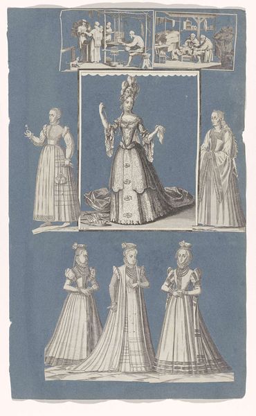 Editor: This is "Kleederdragten," a print, probably an engraving, made sometime between 1843 and 1920 by Ferdinand Rothbart. It illustrates various garments from the early 15th century. I notice how formally the figures are arranged. What can you tell us about this image? Curator: Well, it's important to remember this print was made centuries after the clothing it depicts. Think about the social context in the 19th century, a period very interested in romanticising the medieval period. What kind of function do you imagine images like this had then? Editor: Maybe educational, or perhaps even a form of fashion history. Were they trying to recreate these garments? Curator: Possibly, but more likely this image provided a visual catalogue. Prints like this one circulated widely and influenced perceptions of the past, and were ofter appropriated into stage productions or historical paintings. Notice how precise the engraving is. Does that suggest anything about its intended audience or use? Editor: It does feel meticulous, suggesting perhaps an appeal to a more scholarly or upper-class audience who could appreciate such detail and maybe commission recreations. It seems that historical accuracy wasn’t as prized as the *idea* of history. Curator: Exactly. Consider also how national identity was being constructed in the 19th century. Historical costume played a role in creating a sense of shared past. Editor: So this print isn't just about clothing; it’s a social statement, almost propaganda, packaged in a seemingly neutral historical document? Curator: Precisely. By showcasing these idealized representations, it contributes to shaping how society perceived itself, then and even now. Editor: This changes everything, I thought I was looking at historical record. Curator: Instead it becomes another artifact that provides context of a different era and its intentions.