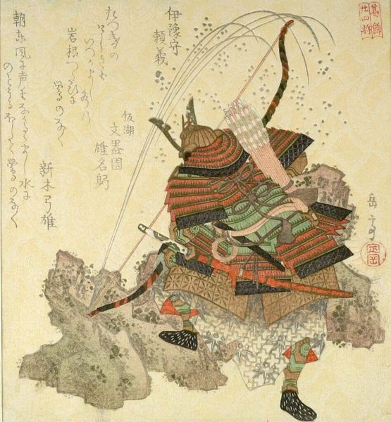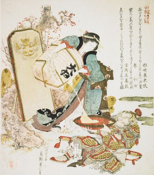 Editor: This is "Puppets Representing Goro and a Fox" by Teisai Hokuba. I am curious about this image, and I notice the figures are holding hammers. What historical context can you give us about this? Curator: Hokuba situates us in the vibrant world of Japanese puppet theatre, Bunraku. Note how the figures, Goro and the fox spirit, brandish their mallets, symbols of power, reflecting the plays' morality tales. Consider how such depictions played into socio-political dialogues. Editor: So, the artist is making a statement about Japanese society and its values? Curator: Precisely. Hokuba uses popular culture to engage in broader cultural commentary. Think about the role of theatre, and how it challenges norms. This art piece offers a lens to explore themes of morality. Editor: This helps me appreciate the layers of meaning. Thanks! Curator: It’s fascinating how art can embody history and activism, isn't it?