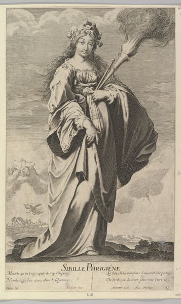 This print, Sibylle Cimmérienne, was made by Gilles Rousselet sometime in the 17th century. It depicts the Cumaean Sibyl, a priestess who, in Roman legend, prophesied the coming of Christ. The print, made in France, participates in a broader cultural trend of aligning classical antiquity with Christian belief. By associating the sibyl with the Virgin Mary, the image creates a symbolic bridge between pagan and Christian worlds. This was a common trope in the art of the time, especially within royal and religious institutions eager to legitimize their power through historical and divine connections. The inscription at the bottom further reinforces this idea, suggesting that the Sibyl's prophecies foretold the coming of a divinely appointed monarch, namely Louis XIV, or one of his successors. For historians, researching the cultural and political context of 17th-century France can reveal the social function of art in constructing and reinforcing power structures.