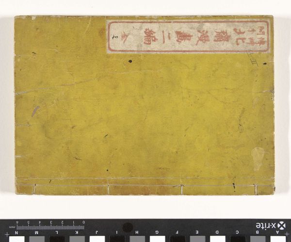 Editor: This is Katsushika Hokusai's Sketchbook from 1819, currently held at the Rijksmuseum. It looks worn and simple; I am fascinated by the texture of the cover and the faded colours. It makes me wonder, what does the overall design communicate, stripped back to just the essential structure of the object itself? Curator: Observe how the geometric rectangles construct the book’s face. There's a dominance of horizontal lines that lend the object stability. Notice the careful, subtle color work of earth tones; it is not an exuberant image but a functional, yet appealing book. We can read this purely through the compositional elements, before even opening it to see the sketches it holds within. Don't you agree? Editor: That's an interesting viewpoint. Is it perhaps also drawing attention to itself as a container of artwork, so people handle it carefully and recognize that it has high intrinsic value, by its protective presentation? Curator: Precisely. Form precedes function, yet it also dictates its value in a tangible way. By that, the artist invites appreciation through visual interaction only, while promising even more in the book's contents, should they open it. The rough condition is perhaps more to do with its history? Editor: I never considered approaching the artwork in this manner before. Thank you for guiding me, this discussion has totally changed my perspective. Curator: Similarly, engaging in this conversation with you has brought forth a deeper, multifaceted appreciation for Hokusai's vision of this object and his intent.