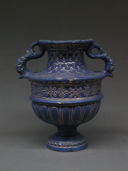 Curator: The "Ewer with bird," crafted around the 12th century and currently housed at the Minneapolis Institute of Art, presents a captivating example of medieval ceramic artistry. Editor: It’s strikingly blue. That cobalt glaze has such a strong presence, almost like looking at something underwater. There is a mystical, alluring feel to it. Curator: Precisely! It is earthenware adorned with a vibrant cobalt glaze, characteristic of Islamic decorative art. Considering its period, this ewer was a significant product, speaking volumes about the era’s technical prowess in ceramic production and its widespread access to materials. It bridges craft and purpose. Editor: The imagery is powerful too; each carefully crafted motif carries significant symbolic weight. The incorporation of the bird suggests freedom or perhaps a connection to the divine in that culture. And those calligraphic bands! I am fascinated by the potential stories etched in those abstract forms. What secrets are locked away? Curator: It reflects trade routes and the movement of raw materials alongside technological knowledge. Who had access to cobalt, and what does that say about networks of power? I always ask these questions when looking at objects such as this. Editor: Good points! Beyond that, this piece reminds me that symbols are always polyvalent. While birds often mean freedom, they also symbolize souls, messengers, or even just a decorative flourish demonstrating an elite patron’s taste and beliefs. Curator: Yes! And who was forming and firing the clay? The conditions, the labor—these aspects matter enormously. How much time and skill went into forming those intricate details versus other contemporary utilitarian ware? Editor: Definitely! The object prompts questions that linger about artistry, faith, and historical meanings that objects often hint at! Thank you. Curator: A lovely analysis; you brought to light the often hidden but extremely present markers and factors behind the materiality.