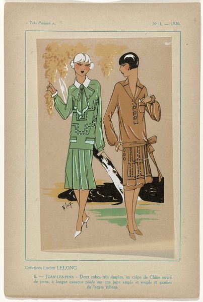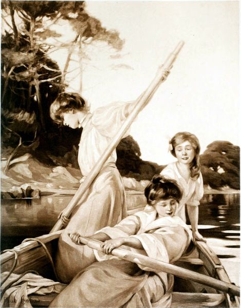 Editor: This “Untitled” watercolor by Harrison Fisher shows two women in wide-brimmed hats and tailored clothes. The sketchy strokes of color feel fresh and light. What sort of stories do you see in the figures themselves? Curator: I see echoes of the "Gibson Girl," the idealized image of feminine beauty at the turn of the 20th century. Fisher actually competed with Charles Dana Gibson to define this iconic figure, so these women, despite being “Untitled,” carry all that symbolic weight. The feathered hats, for example, speak volumes about social status, aspiration, and, perhaps, the cost of beauty on the natural world at the time. Do you pick up on other visual cues that suggest a certain era or social context? Editor: Yes! The long skirts and fitted jackets do give a very particular Edwardian flavor. Is there a message embedded in their poses, as well? Curator: Precisely! Consider the tilt of the heads, the slight smiles. These are carefully constructed images of self-assuredness but also of a certain demure charm, a carefully policed femininity. Even their connection—one woman’s hand resting on the other’s— hints at a shared understanding, a sisterhood… though even that’s been stylized, hasn’t it? Think about what the artist chose *not* to include, to emphasize these visual and cultural symbols. Editor: That's so interesting. I never would have considered the implications of the hats! I now see the painting as carefully constructed and not just a charming scene. Curator: Indeed. And remember, even seemingly "natural" images often carry layers of cultural memory and aspiration, waiting to be decoded.