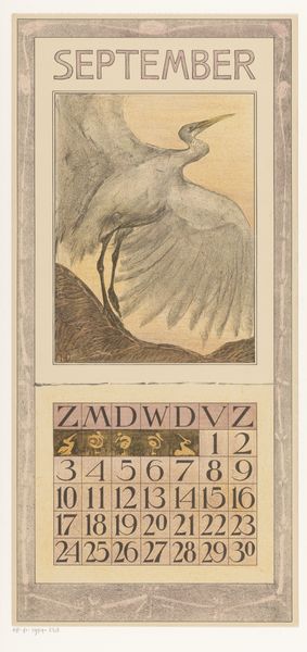 Editor: This is Theo van Hoytema’s "Kalenderblad oktober met drie vogels," a lithograph from 1904 here at the Rijksmuseum. The composition is so striking. The muted palette and graphic style almost create a somber mood, even with the beautiful birds. What do you make of it? Curator: It reminds me of autumn afternoons, lost in reverie as birds fly overhead... Their movements can be melancholic. But beyond this sentiment, this lithograph—a type of print—encapsulates the essence of Art Nouveau, where nature is both observed and stylized, wouldn’t you agree? It's like a visual poem where October's spirit is found in the flutter of wings and a date grid. See how the birds are rendered, not quite realistically but with an incredible eye for line and form? Editor: Definitely. The almost abstract rendering is something. I hadn’t thought about how perfectly the image works as a calendar! Is there something particularly Dutch about this blend of naturalism and graphic design? Curator: Hmm, I think so! Hoytema's deep connection to the Dutch landscape and his sensitivity to capturing nature's subtle details ties perfectly with the very practical purpose of a calendar. But also there’s this move toward simplification of forms – it shows how the Netherlands were participating in broader European movements. What I love about it is its simultaneous appeal to decorative and utilitarian desires. Do you see that balance? Editor: Yes, I think I do. I appreciate how the piece made what otherwise would have been simple dates and numbers, more poetic and artful. Curator: Precisely! Art Nouveau aspired to infuse everyday life with beauty. Something as mundane as a calendar becomes a work of art – a reminder that beauty can be found even in marking the passage of time. It's truly a celebration of nature's rhythms woven into the fabric of our daily lives, wouldn’t you agree?