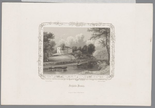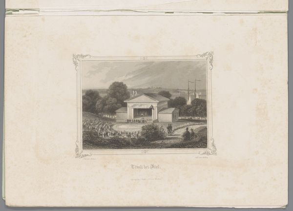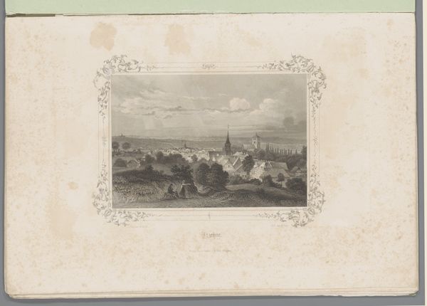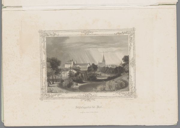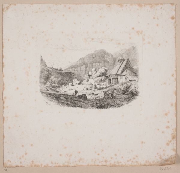 Georg Michael Kurz created this print, "Gezicht op een molen bij Malente-Gremsmühlen," capturing a landscape dominated by a windmill on a hill. The eye is immediately drawn to the contrast between the dark, detailed foreground and the softer, rain-swept sky. This stark contrast isn't just a trick of the light; it structures the entire image, creating a visual hierarchy that pulls you into the scene. Notice how the windmill isn't just a picturesque detail but a focal point, commanding attention. The verticality of the trees and the windmill contrasts with the horizontal sweep of the landscape. This play with vertical and horizontal lines creates a visual tension, disrupting any sense of static harmony. The print isn't simply representing a scene; it's constructing a discourse on landscape, industry, and the sublime. The artist challenges the viewer to reconcile the idyllic with the functional, prompting a deeper reflection on our relationship with the environment.