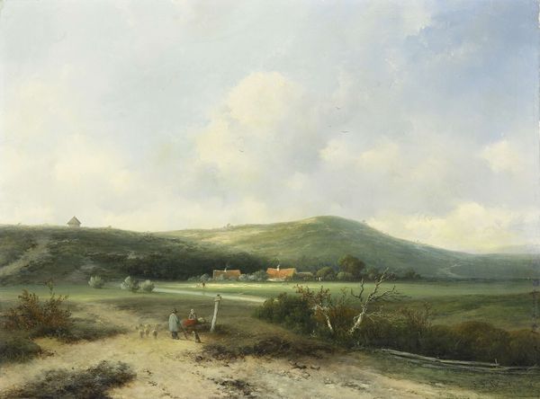 Curator: Ah, this painting just sighs with quiet, doesn’t it? “Between the Sierras and the Coast Range, California” is the title—and I have to say, Hermann Ottomar Herzog, the artist, really captures something of that vast, almost melancholic Western light. Editor: It certainly evokes a sense of solitude, a vast, open landscape that reads almost like an elegy. Thinking about the time it was painted—the era of westward expansion—it begs the question: whose solitude are we witnessing? Whose story isn't being told in this seemingly empty space? Curator: That’s interesting. I was struck more by the detail in the foreground—the prickly pear cactus, the scrubby brush. There’s a resilience in that tough vegetation, battling the dry earth, don't you think? It almost vibrates against the distant hazy mountains. Editor: I agree that the vegetation has an undeniable presence, yet even the cactus serves as a marker of contested space. These landscapes weren't simply "discovered," they were actively taken, reshaped, and often scarred through violent encounters with Indigenous populations and unsustainable resource extraction. Curator: I can appreciate that, but also, is it okay to just see a beautiful sky? I mean, must beauty always be inherently problematic? Sometimes, just sometimes, can a bird just fly without it becoming a symbol of displaced peoples? I feel like beauty is already an inherent act of rebellion; what else can it be if not that? Editor: Well, of course the painting is beautiful. It’s just crucial that we ask ourselves "for whom?". By whose standards are these aesthetics coded? Art offers an avenue for challenging existing hierarchies by interrogating, not merely accepting, accepted notions of beauty and progress. These land-based epistemologies must, too, guide how we navigate its representation and its coloniality. Curator: So you’re not feeling any sense of... optimism? The suggestion of journey? Doesn’t it make you want to get in your car and drive into that scene? It makes me want to grab a cowboy hat! I love imagining the smell of dust and sage... maybe I romanticize it. Editor: Romanticization is the problem. Though it's understandable to respond emotionally, we have to guard against repeating romanticized narratives. Let's remember the human costs. Curator: Fair point, fair point. So perhaps what I’m seeing as a quiet resilience, you’re seeing as a... a memorial? Editor: Yes, a site laden with both visual allure and historical tension. It demands that we engage with its multifaceted past rather than consume it as a picturesque vista. Curator: Well, I suppose, either way, Herzog certainly gets us thinking, doesn’t he? Food for thought… with a prickly pear garnish! Editor: Precisely, an enduring reminder of how art serves as an urgent invitation to understand our collective history while decolonizing the lens through which we observe it.