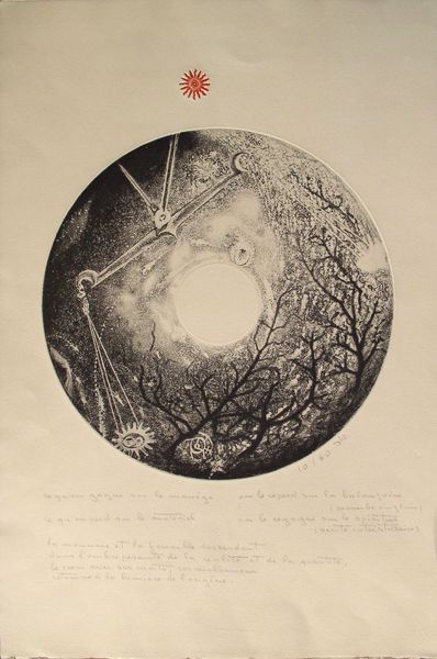 Editor: This striking, monochrome print, called "Untitled" and made using etching, presents a fascinating image. I’m immediately struck by the dominance of the circular form – it reminds me a bit of a cog or maybe even a fractured lens. How do you interpret this work? Curator: That's a very perceptive reading, especially the "fractured lens" aspect. Considering this print's possible focus on human nature, the broken circle might represent the fragmentation and the inherently flawed or 'broken' condition of modern society. What’s key for me here is considering the cultural moment. What philosophical movements do you think could resonate with such a composition? Editor: Well, the monochrome, the abstract geometry... Maybe Existentialism? The idea that existence precedes essence, a kind of fractured identity searching for meaning. Curator: Exactly! And if we extend that to socio-political spheres, we might think of the disorienting impact of rapid industrialization or even colonial legacies. How do you think the smaller images within the circle interact with this larger reading? Editor: I see those as like distorted echoes within the larger form. If we follow the idea of fractured identity, they could be pieces of a shattered whole, representing individual experiences lost within broader societal structures. Curator: Precisely! This interplay between the personal and the collective is at the heart of many socio-political struggles. The work challenges us to recognize these embedded perspectives and start conversations about a new vision for an all-inclusive community that shares collective ideas and is representative. Editor: That makes me see the work in a new light. I originally saw the fragmented circle as just an aesthetic choice, but the conversation about a unified, representative society offers another interpretation! Curator: Indeed! Engaging with a work like this makes it about much more than pure aesthetic, inviting an entry point into social theory through a unique arrangement of graphic expression.