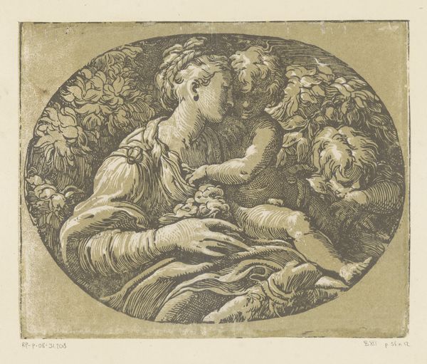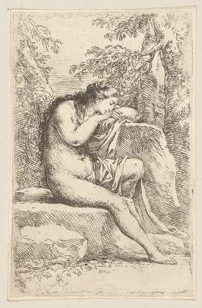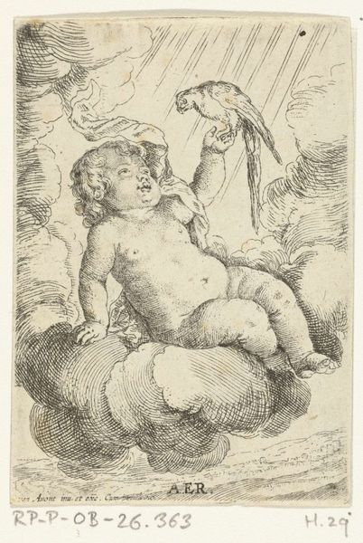 Curator: There's a palpable innocence, even vulnerability, in these clustered figures—a gentleness amplified by the swirling strokes that render them. Editor: We're looking at Laurent de La Hyre's "Four Bacchic Children," an engraving that dates to around the 1620s. La Hyre offers us a vision rooted in classical themes, but refracted through his distinctive sensibility. Curator: Bacchic, certainly, but far from the frenzied revelry one might expect. This is the mythic infancy, a safe prelude to the wine god's later escapades. I can imagine this imagery being very palatable in bourgeois households during this era, something to put on display. Editor: Yes, these aren't Caravaggio's brazen Bacchuses! There is, of course, the historical backdrop—the Counter-Reformation influencing even secular art with a strain of morality and reserve. The unbridled nature, a hallmark of Bacchic imagery, has been thoroughly pruned in deference to prevailing religious and cultural mores. It domesticates divinity. Curator: Yet, this pastoral scene isn't devoid of symbolism. Observe the figures, intertwined within a landscape heavy with leafy vegetation, and the prominent positioning of a discarded barrel on its side—the symbolic presence of the vine lingers, though controlled. It is like they have the instrument to the excess, but it’s left aside as these young characters revel in childlike discovery, hinting that pleasure can exist beyond intoxicating revelry. The very notion of childhood offers freedom from rigid moral constraints. Editor: Exactly, we see La Hyre engaging in a subtle social dialogue, hinting at libertine ideas but never overtly challenging norms. What does it say about the emerging art market in Paris? This print offered access to these mythic allegories to a much broader audience beyond courtly or aristocratic patrons. It makes us ask: How do these classical symbols evolve as they move from court to print? Curator: A compelling reflection—this art embodies continuity through transformation, showcasing the ability of symbols to retain echoes of earlier meanings as it mirrors contemporary values. It speaks to the very essence of memory itself! Editor: It's fascinating how La Hyre's era imbued its own concerns into those antique echoes. We are both seeing those voices through a later vantage as well.