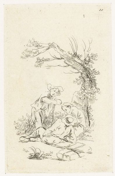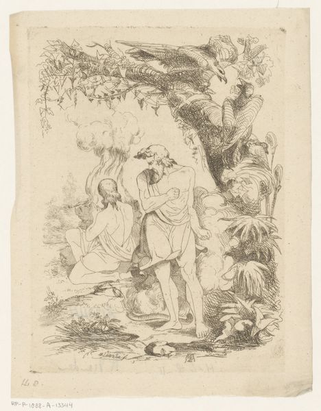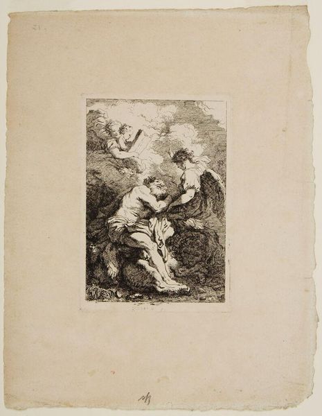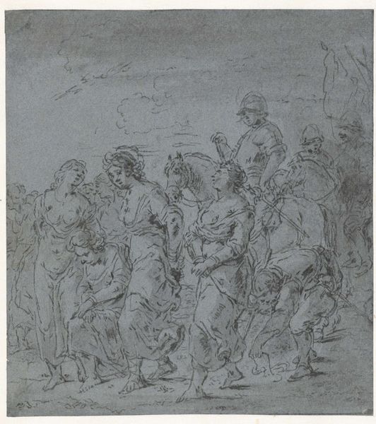 Editor: This is Thomas Stothard’s “A Group, Kneeling Figures to Left, and a Flying Figure,” currently held at the Tate. It seems to depict a moment of revelation, perhaps even divine intervention. What symbolic weight do you see in this composition? Curator: The upturned gazes, the supplication... it evokes a sense of awe, doesn't it? Consider how consistently these postures and gestures appear across cultures when representing humility before power. Is it learned, inherited, or both? Editor: That’s interesting. So the flying figure could be a shared cultural representation of power? Curator: Precisely. Flying figures are a near-universal symbol of divinity. Stothard's choice taps into that deep-seated understanding. It makes me wonder about the durability of visual language through time. What do you think? Editor: I never thought about imagery in that way. Thanks! Curator: My pleasure! Considering the enduring nature of certain symbols gives us a glimpse into the collective human psyche.