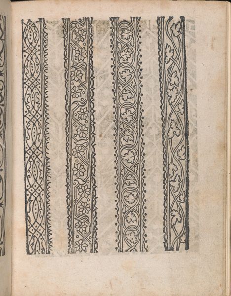 Curator: Look at this mesmerizing page! We’re viewing “Essempio di recammi, page 18 (recto),” from around 1530, by Giovanni Antonio Tagliente. Editor: The crisp black ink against the aged paper creates a very striking visual contrast. The designs appear quite dense. Curator: Yes, these are engraving and ink drawings, serving as embroidery patterns for needlework books. What resonates with me are these intricate geometrical forms – each design contains deep historical resonance, echoes of cross-cultural interactions and long traditions of craftsmanship. Editor: From a formalist point of view, there's a beautiful balance between the varying rectangular and circular shapes. The placement of those shapes, the bold lines, creates an intriguing positive and negative space relationship. Do you see any symmetry within these designs? Curator: Indeed! The interplay and tension you're speaking of exists alongside clear symmetrical choices in each element. Notice the endless knots of the primary rectangle design, their association with continuity and eternity, symbolizing resilience throughout turbulent times. Editor: Those bold black lines provide such clear outlines. This work seems deliberately graphic. There's not much room for mistakes in print. Curator: This work offers a powerful lens into Renaissance artistry and practical design. Its bold patterns mirror the socio-cultural exchanges occurring during the era. Editor: Absolutely! The work’s graphic style resonates even today. It could inform modern designs. It holds that timeless, enduring quality. Curator: Examining pieces like these helps us recall stories, revealing art's powerful way of reflecting our shared heritage. Editor: Studying Tagliente's visual arrangements offers a timeless lesson in striking and concise design.