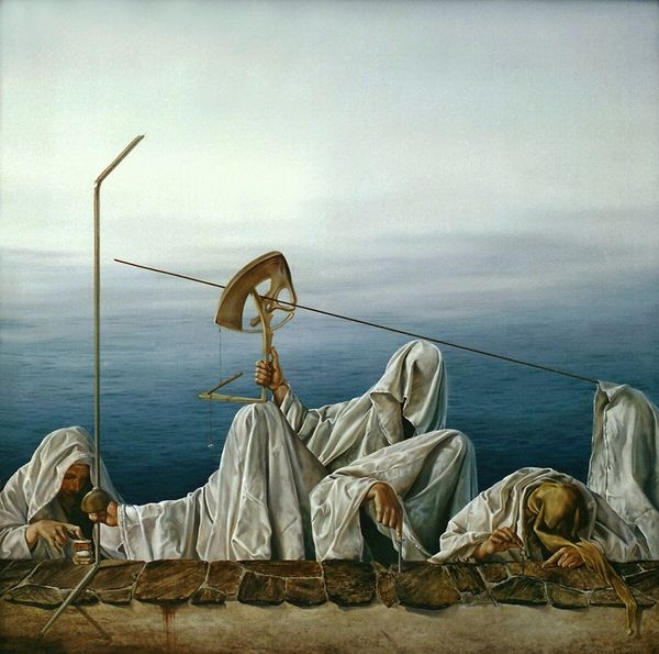 Siegfried Zademack’s painting, "Auf dem Weg" is made with a traditional approach to mark making, an approach that uses the medium to create a portal into a dream-like psychological space. Zademack constructs a scene with a figure standing in a boat with the sun shining from where his head would be. The paint is smooth, and it seems to glow from within, almost like an early Renaissance painting. The marks are concealed to show off the world that is revealed, but if you look closely you can see a soft layering of tones. This is especially visible in the build-up of paint that is used to create the sky. I’m reminded of Caspar David Friedrich, in the way that both artists create allegorical figures that evoke a sense of wonder, and maybe even a little fear. It’s art as a form that embraces questions rather than answers, inviting you to find your own way.