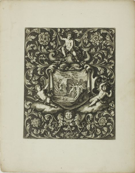 Curator: My initial reaction is that it has a very constrained palette, doesn't it? Brown and gold mostly. Editor: Indeed. This piece, dating from around 1936, is William Roberts' watercolor and ink drawing entitled "Coat of Arms." It is academic in its precision but leans heavily into decorative art through heraldic elements. Curator: Those three faces… lions perhaps? Staring right at us, frontally posed within the central escutcheon. They have a hypnotic quality. Heraldry is so good at making symbols that compress cultural assumptions and familial aspirations. Editor: And notice how Roberts uses the watercolor to simulate texture—the metallic sheen of the helmet, the velvety black of the background. The tight framing, too, contributes to the almost claustrophobic, intense effect. Curator: Precisely! The leaves, gilded and entwined, nearly choke the shield. This feels like a study of tradition as both empowering and confining. The inscription, "BY THE NAME OF WILLARD," solidifies a claim, a lineage. What cultural anxieties might Roberts be hinting at through the image? The weight of expectation maybe? Editor: One could say he seems to explore the potential of the line itself to conjure wealth and social elevation, not necessarily represent a concrete entity, with the emphasis on ornament and pattern over perspectival depth. And, dare I say, a slightly flattened space—heraldry distilled as decoration. Curator: It’s definitely interesting to ponder its place in that specific period, considering the rise of Fascism across Europe and the need for symbols to unite and claim identity. Editor: Fascinating how a seemingly static image becomes a lens to contemplate wider social forces. Curator: Agreed, thinking of collective identity through emblems offers layers to its creation. Editor: A curious synthesis of style and social comment indeed.