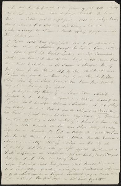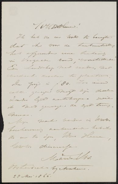 Curator: Oh, how delicious! To get up close and personal with Zimmerman’s pen and ink… It's like stumbling upon a private thought, isn't it? Editor: It really is. This is a letter titled “Brief aan Frans Buffa en Zonen,” possibly from 1873, done with pen and ink on paper by Hendrik Jan Zimmerman. The script looks very elegant. What can you tell us about it? Curator: Well, look closely at the pressure of the pen, the almost nervous energy in the strokes. This isn’t just calligraphy; it's a performance of sorts, isn’t it? One man trying to communicate his thoughts in a stylish, yet ultimately vulnerable way. Makes me wonder, what’s he so anxious to convey? Editor: It’s beautiful handwriting. Did letter-writing elevate everyday language into an art form at that time? Curator: Absolutely! Think of the epistolary novels, the power of carefully chosen words sent across distances. This letter participates in that tradition, even in its informal, almost sketchy quality. This makes me think of all those untold stories carried by fragile paper. Editor: I can almost feel the writer's urgency. Curator: Exactly! It's like glimpsing into his world, into the very act of creation, thought flowing directly onto the page. Each word seems weighted, doesn’t it? Each flourish alive. Editor: I’ll never look at handwriting the same way again! Curator: Me neither, it is amazing what hidden layers reveal themselves once we take a closer look.