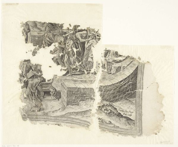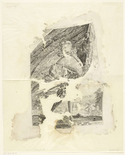 This work, Vaandeldrager, of unknown date, is rendered in pencil on paper. The composition presents fragmented images, each meticulously detailed yet disjointed, which evokes a sense of deconstruction and perhaps even the ruin of memory. The upper section features the titular standard-bearer, emerging from what appears to be a flag or banner, while the lower sections offer glimpses of landscape and figures, obscured by tears and gaps in the paper. These absences are as meaningful as what is present, inviting reflection on what is lost and what remains. The artist here employs a strategy reminiscent of collage but executed entirely through drawing. The use of pencil allows for a range of tones and textures, emphasizing the materiality of the paper and the physical act of creation. This piece unsettles conventional notions of representation, reminding us that art is not merely a reflection of reality but also a construction, subject to fragmentation and reinterpretation.